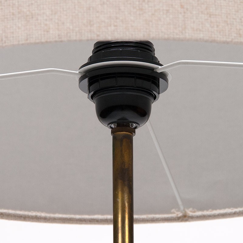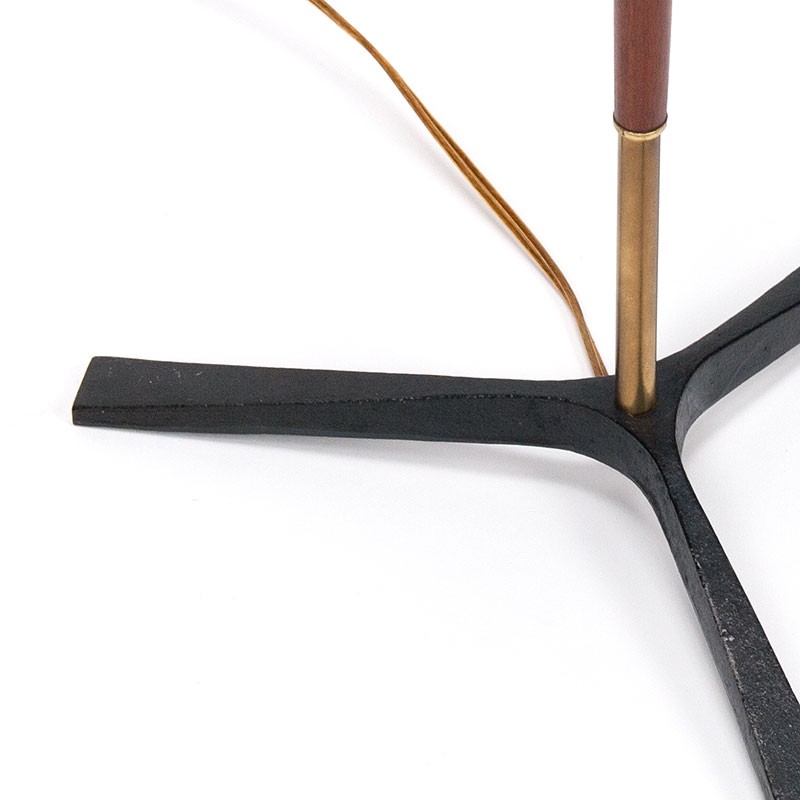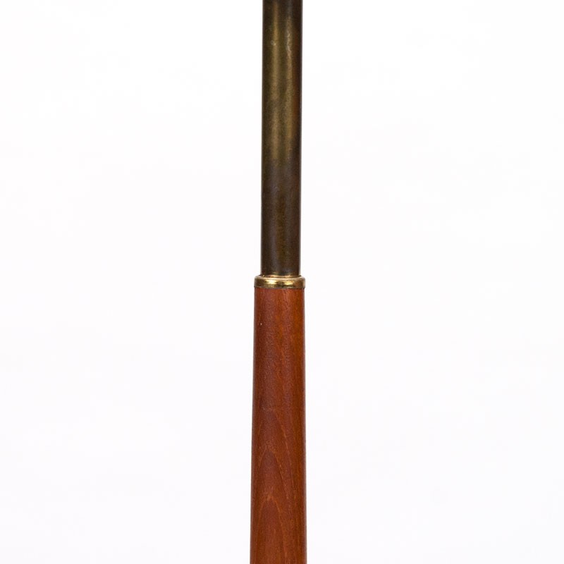 Stijlvolle vintage vloerlamp uit de eind vijftiger jaren, Denemarken. De slanke voet, van teakhout en messing, staat op een gietijzeren zwarte driepoot. De kap is vervangen voor een nieuw exemplaar. De conditie is goed, zie details. De afmetingen zijn 156,5 cm hoog en 40 cm in diameter.