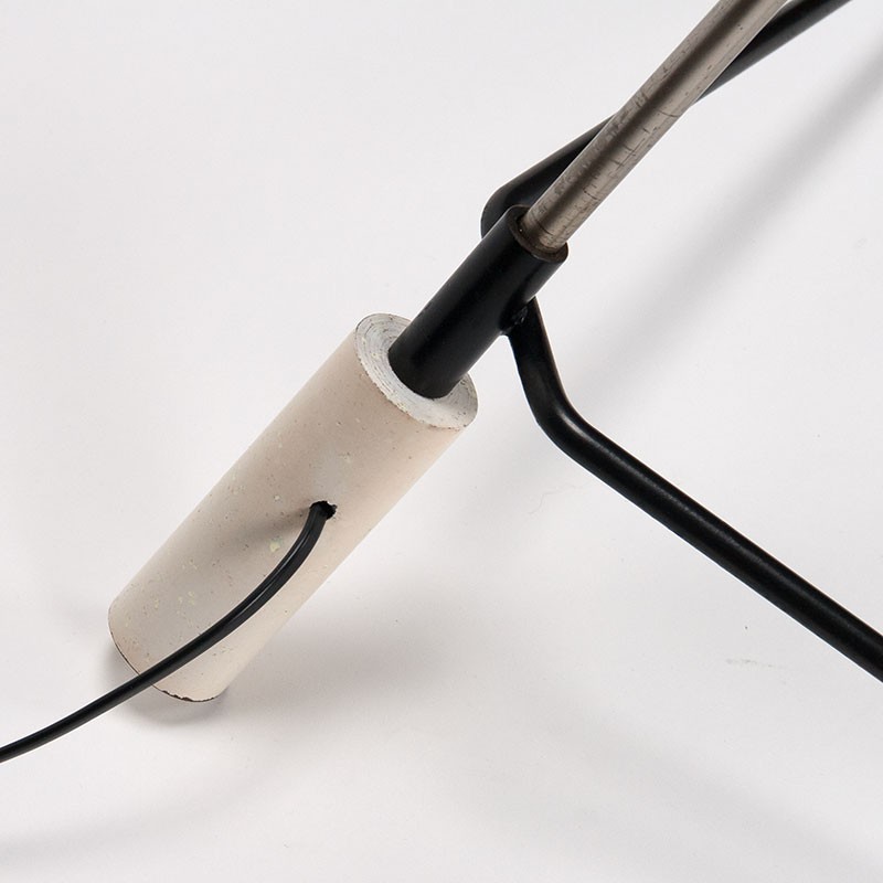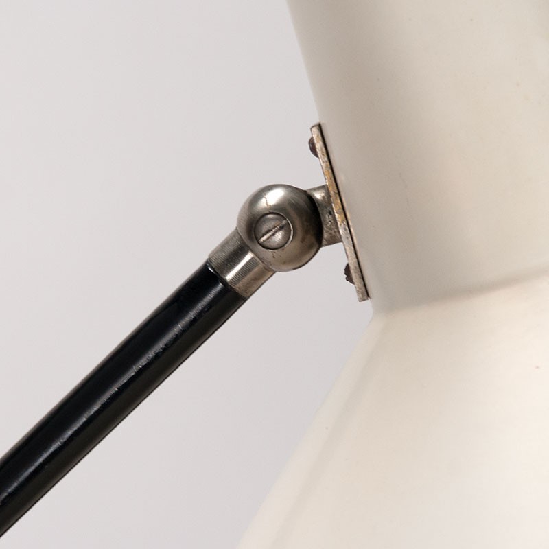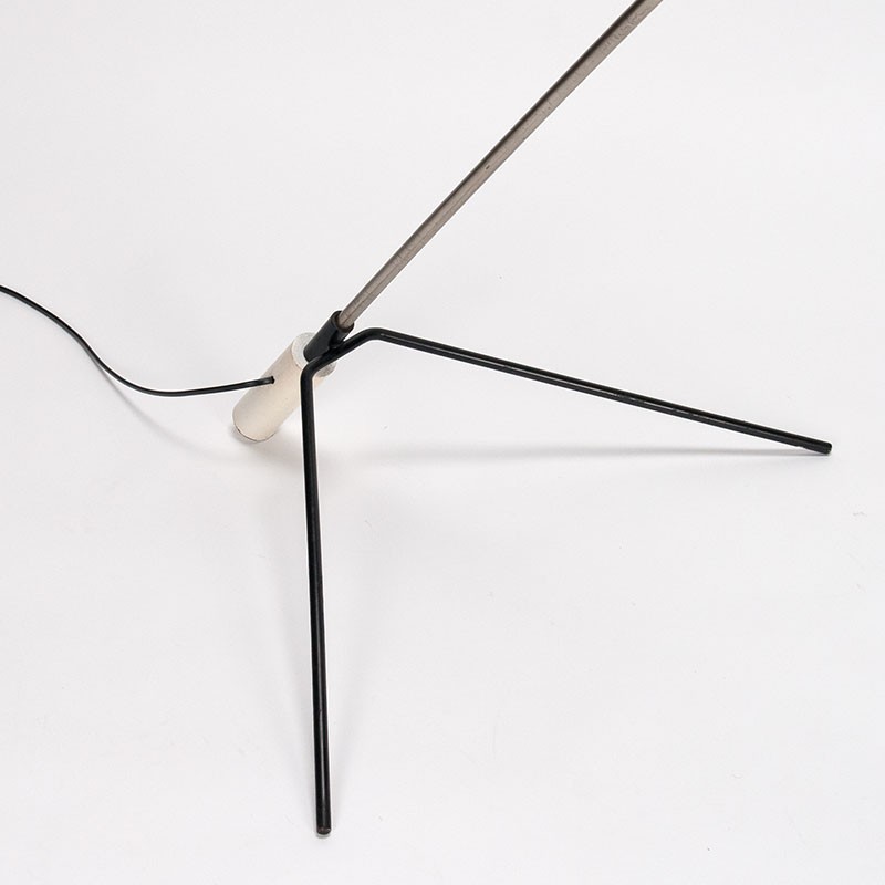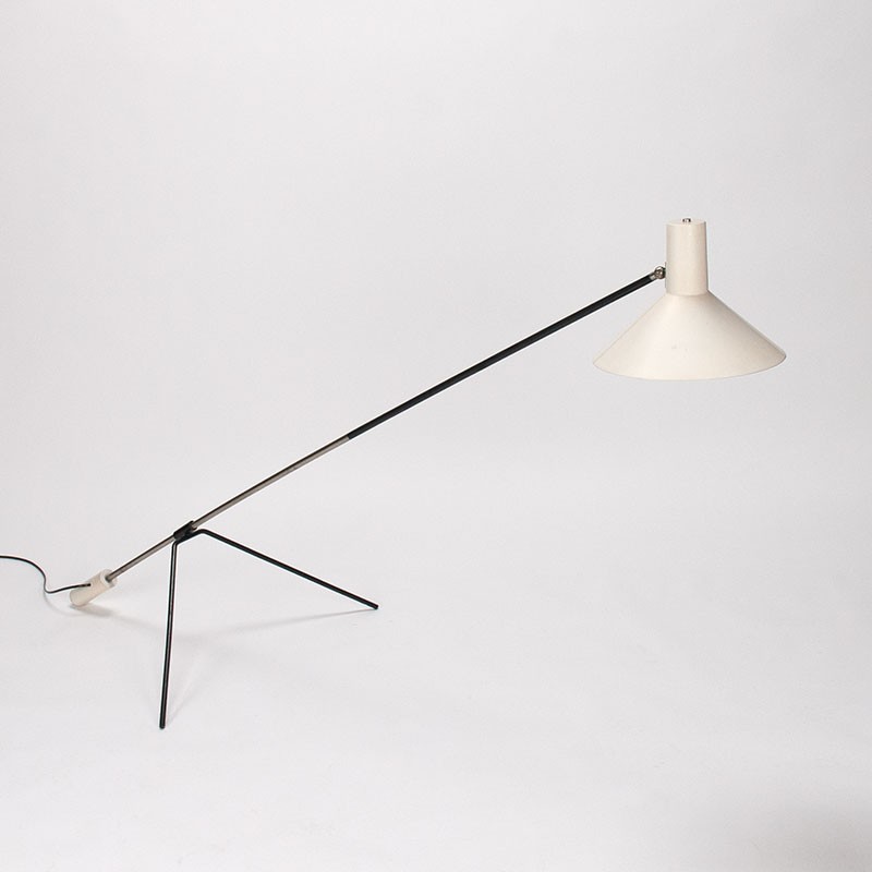 Zeldzame originele sprinkhaan vloerlamp uit de midden jaren vijftig. Ontworpen door J.J.M Hoogervorst en uitgebracht door Anvia als model 1502. De vintage lamp heeft een contragewicht waarmee de lamp in hoogte te stellen is. De kap is creme wit van kleur, de metalen buis is half zwart ( origineel). De conditie is goed gezien de leeftijd, geen deukjes iets vlekjes op de kap, zie details. De afmetingen zijn 140 cm hoog, de kap is 27,5 cm in diameter.