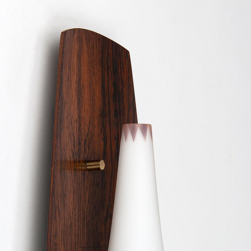 Vintage wandlamp uit de eind vijftiger, begin zestiger jaren. Mooi model met palissanderhouten muurdeel en bewerkt glazen kapje. De conditie is goed, zeer minimale gebruikssporen ( glas intact en bedrading vernieuwd), zie details. De afmetingen zijn 13 cm breed, 10 cm diep en 33,5 cm hoog.