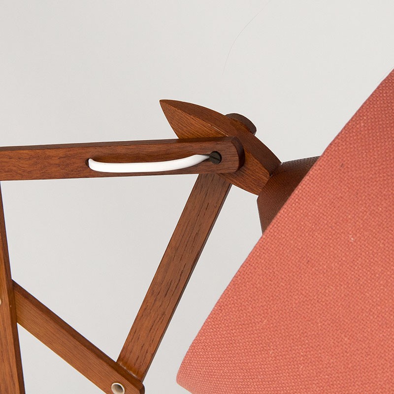 Mid-Century teakhouten wandlamp, schaarlamp model, uit de eind vijftiger jaren. Mooi vormgegeven met een uitschuifbare arm, waardoor de lamp goed gericht licht kan geven. De kap is vervangen voor een nieuw exemplaar. De conditie is goed, bedrading vervangen, zie details. De afmetingen zijn van de kap 25 cm in diameter de lengte is minimaal 50 en maximaal 100 cm.