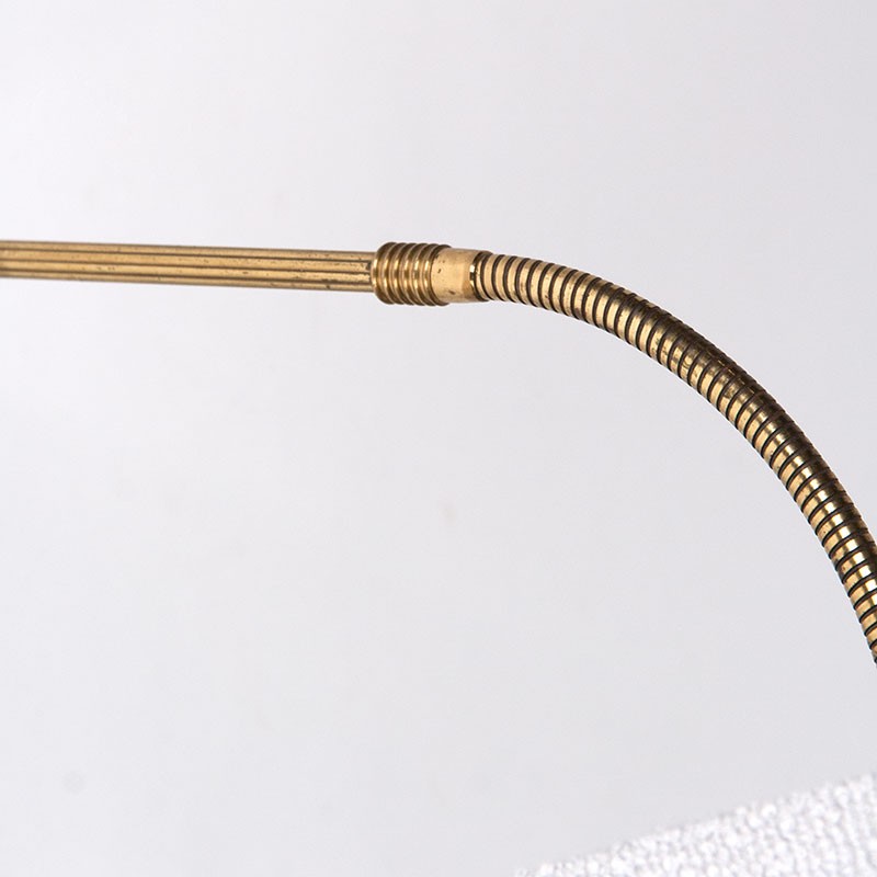 Mid-Century wandlamp met messing armatuur en stoffen kap. De lamp is afkomstig uit de vijftiger jaren, Denemarken. De arm is zwenkbaar en flexibel waardoor het licht goed te richten is. De kap is vernieuwd. De conditie is goed, bedrading vervangen. De afmetingen zijn in lengte maximaal 60 cm, de kap heeft een diameter van 25 cm.