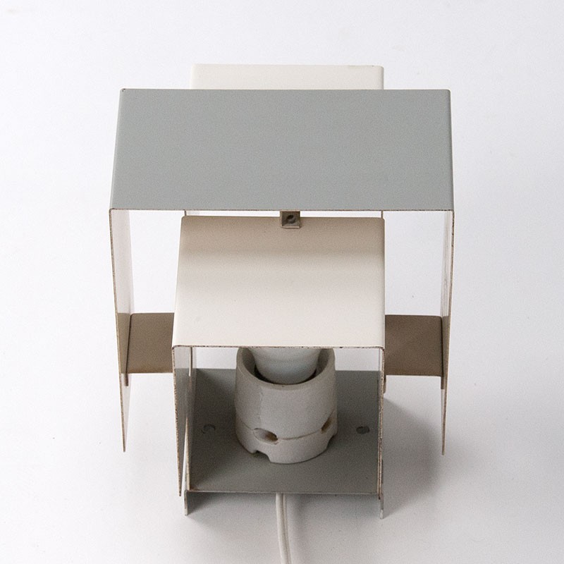 Minimalistisch ontworpen wandlamp uit de begin zestiger jaren. Uitgebracht door Philips. De lamp is uitgevoerd in wit en grijs metaal en heeft een porseleinen fitting. De conditie is goed gezien de leeftijd, enkele minimale gebruikssporen. De afmetingen zijn 15,5 cm breed, 20 cm diep en 20 cm hoog.
