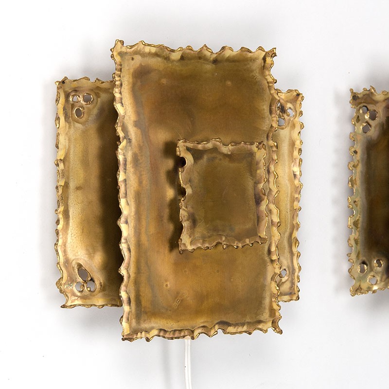 Vintage set van 2 wandlampen ontworpen door Svend Aage Holm Sørensen. Model 5202, uitgevoerd in messing. De set is gemerkt. De conditie is goed, bedrading nagekeken. De afmetingen zijn 20,5 cm breed 5,5 cm diep en 21 cm hoog.